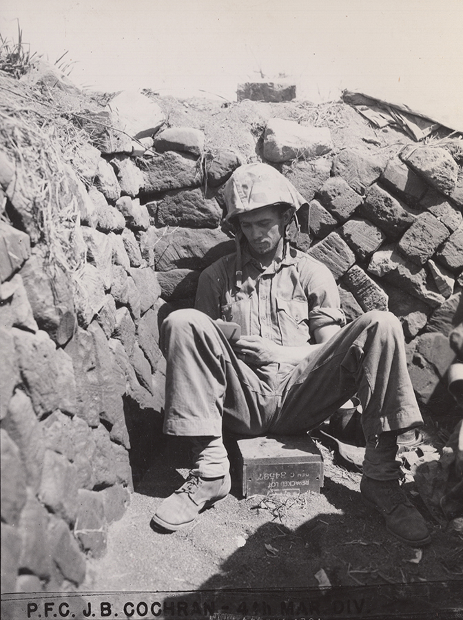Iwo Jima: PFC Robert E. Carmichael (B/1/24) "writes first letter home since landing on D-day." USMC photo.