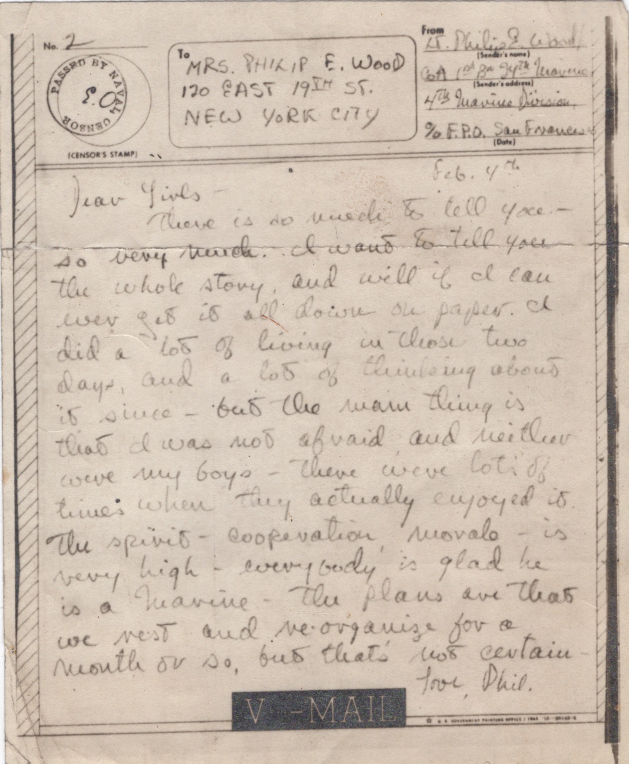 There is so much to tell you – so very much. I want to tell you the whole story, and will if I can ever get it all down on paper. I did a lot of living in those two days, and a lot of thinking about it since – but the main thing is that I was not afraid and neither were my boys – there were lots of times when they actually enjoyed it. The spirit – cooperation, morale – is very high – everybody is glad he is a Marine – the plans are that we rest and re-organize for a month or so, but that’s not certain.
