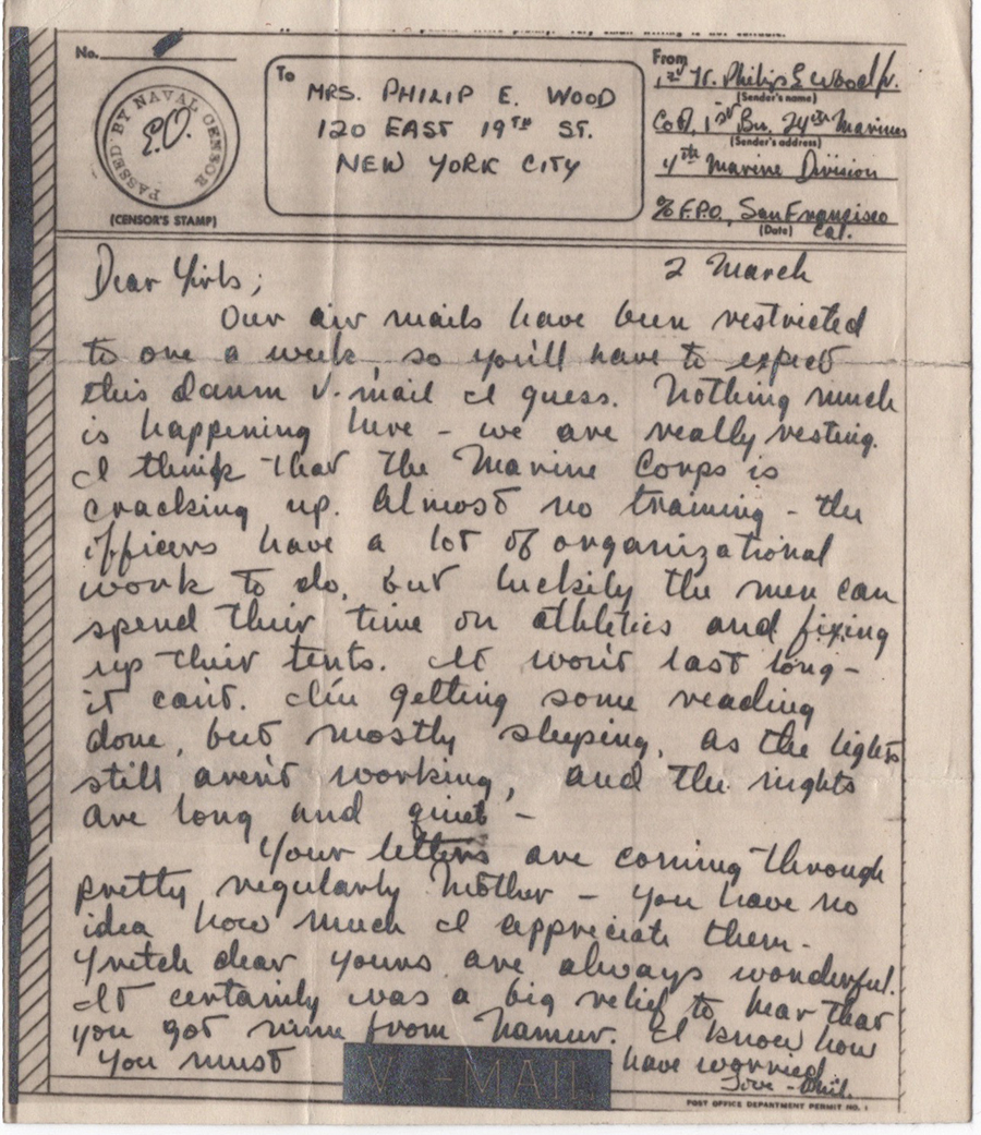 Our airmails have been restricted to one a week, so you’ll have to expect this damn V-Mail I guess. Nothing much is happening here – we are really resting. I think the Marine Corps is cracking up. Almost no training – the officers have a lot of organizational work to do, but luckily the men can spend their time on athletics and fixing up their tents. It won’t last long – it can’t. I’m getting some reading done, but mostly sleeping, as the lights still aren’t working, and the nights are long and quiet.
