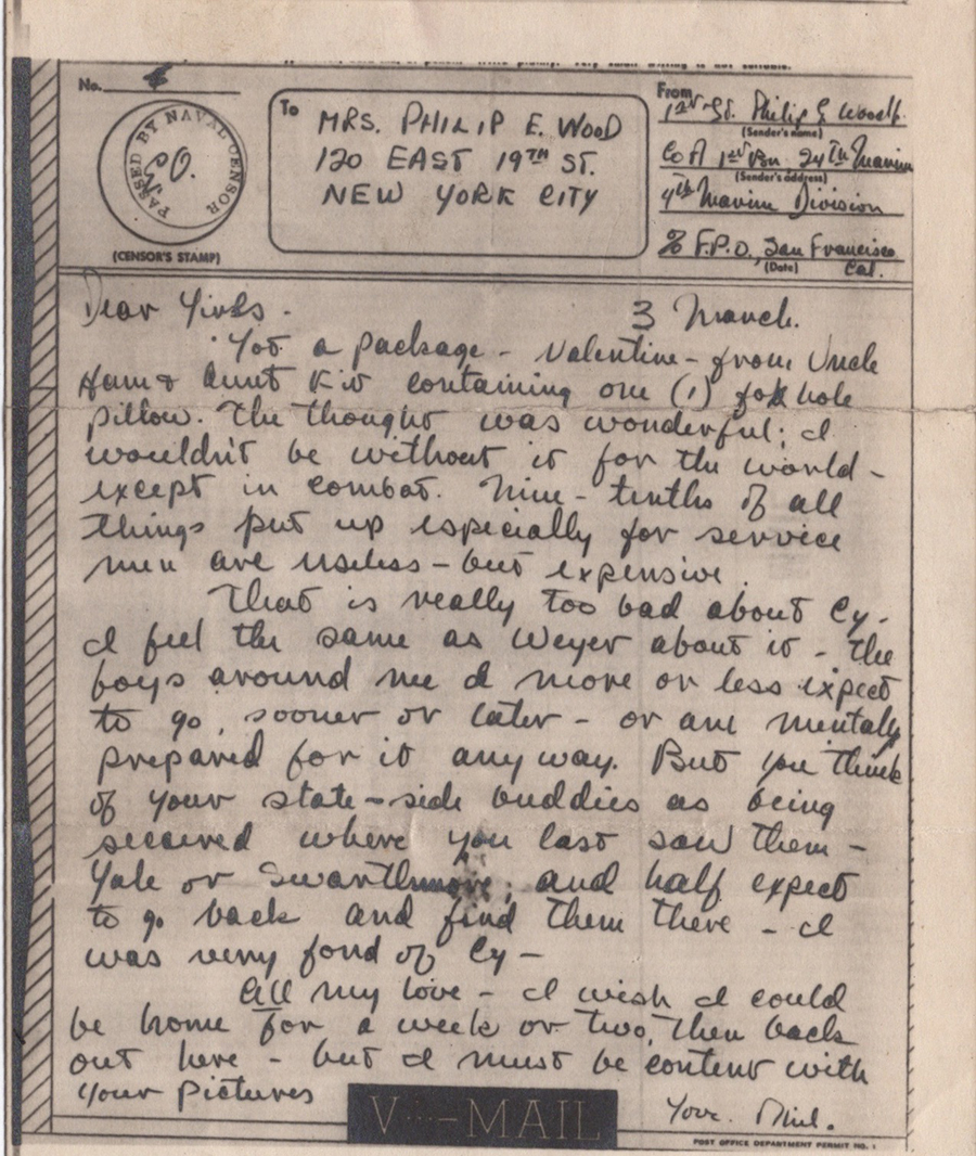 [2] Little is known about Cy outside of a reference to a visit in May 1943. He appears to have been a civilian friend living in San Diego, and the implication here seems to be that he has died. “Weyer” was perhaps a mutual acquaintance.