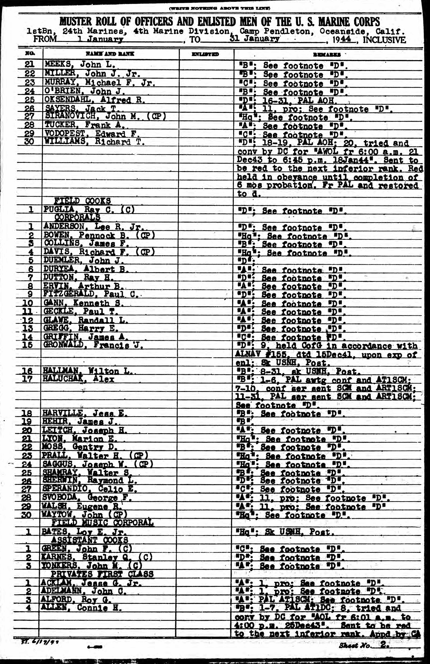 Clerks learned a dizzying array of abbreviations and designations, the correct forms to use (NMC 107 and 107a), and the proper way to type them (black record ribbon). Their work would be reviewed and corrected by senior NCOs and signed by the commanding officer before being forwarded to Headquarters, Marine Corps for permanent filing. The clerks were only human and made occasional mistakes; naturally, these errors occurred more frequently when a unit was in combat. However, muster rolls are generally considered to be authoritative sources today – just as they were intended to be in the 1940s. The rolls for 1/24th Marines are the primary source used to define the narratives and fix dates throughout this history.