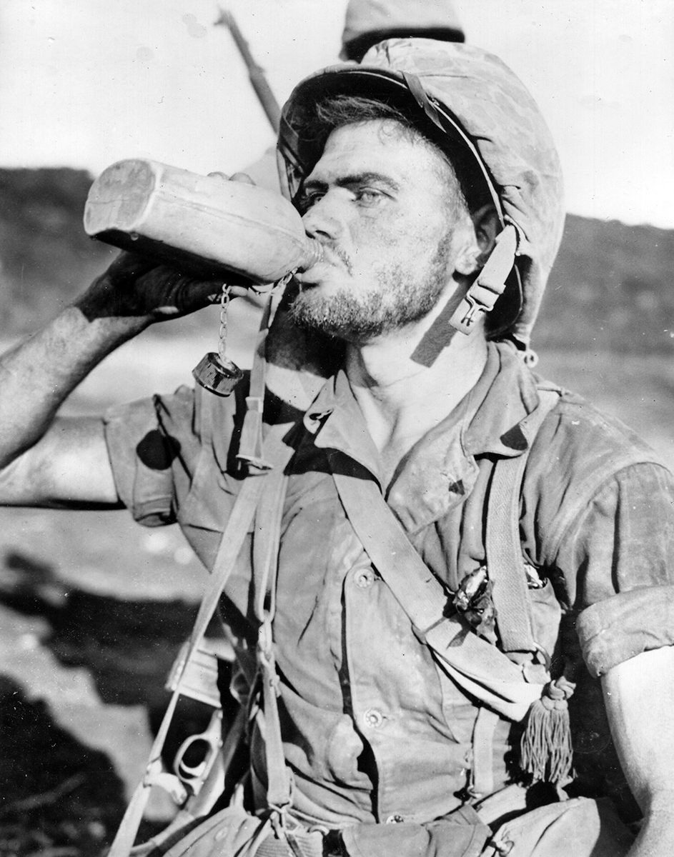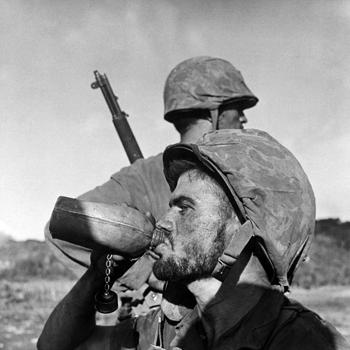 Troutman and Smith knew a good shot when they saw one, and both whipped out their cameras. Troutman caught the Marine in a three-quarters shot, while Smith snapped one directly in profile. The Marine, probably perplexed at the sudden attention, stopped and glared over his shoulder at the photographers. Troutman scribbled Marine drinking water from his canteen in his notepad, and either he or Smith approached the exhausted warrior to ask his name and hometown.[36]