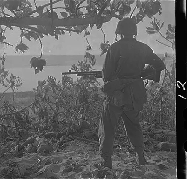 I pushed myself with my hands and dragged my legs to reach my BAR. I didn't worry about my helmet. One or two [Japanese] were still trying to operate, but every time they moved I'd give them a burst of bullets.