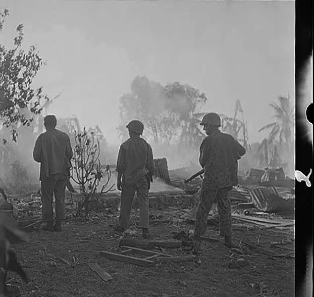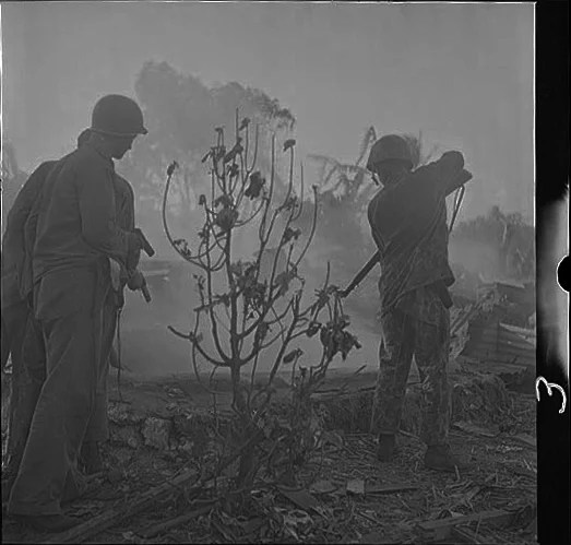 The field was dotted with bundles of sugarcane cut and ready for harvest. A sudden shot rang out from one of the piles; The Saint stumbled and sagged to the ground. Seconds later, Buller dropped with a bullet through his face. “There were men underneath,” said Buzzard. “They killed Santilli, and they killed Sergeant Buller. They were shot within seconds of each other.” A cold, murderous rage descended on Glenn Buzzard, and he turned his weapon on the fleeing crowd of civilians. “Neutralized them, let’s say.”[22] Sergeant Miller M. Blue quickly assumed command of the platoon.[23]
